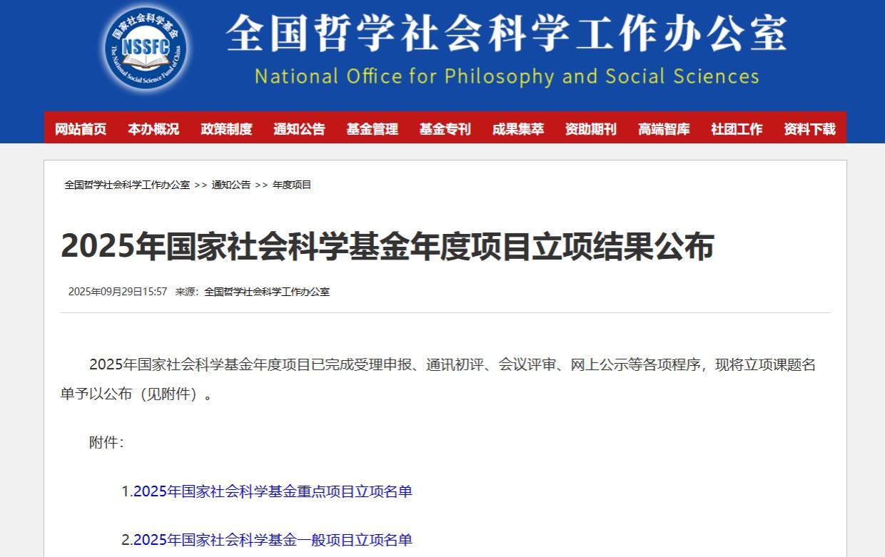 9月29日,全国哲学社会科学工作办公室公布了2025年国家社会科学基金年度项目立项结果,91网站